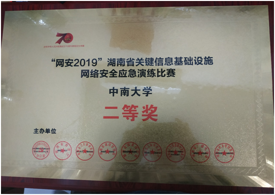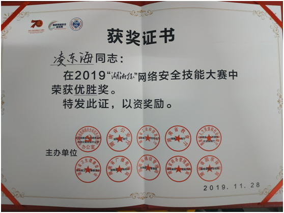 极光网络安全实验室的同学在2019“湖湘杯”网络安全技能大赛系列活动——关键信息基础设施网络安全应急演练比赛中获得二等奖,同时在湖湘杯网络技能大赛决赛中获得优胜奖。