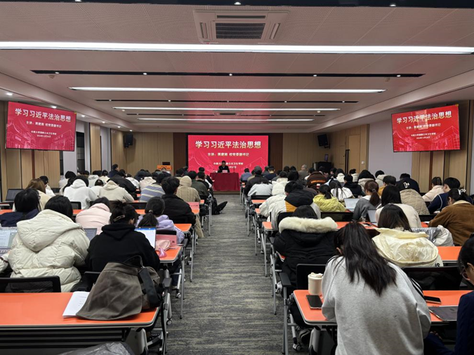 蒋建湘副书记介绍了习近平法治思想的形成标志,并概览了十一个坚持的主要内容,讲解了其四大特征:时代性、实践性、创新性和体系化。深入剖析法治思想的时代性特征,回答了全面依法治国的时代之问,并探讨了习近平法治思想的创新性,特别是在从“制”到“治”的变化,从“旧十六字”到“新十六字”,“依法治国”到“全面依法治国”以及“法律体系”到“法治体系”的转变,彰显了法治思想的历史飞跃。