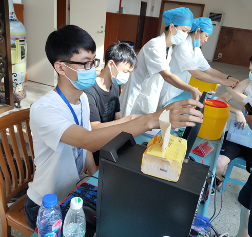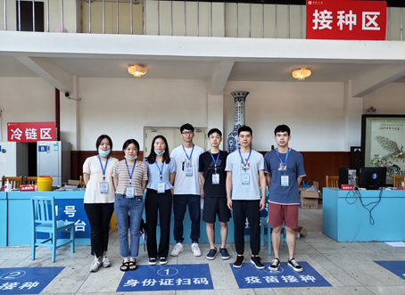 铁道学院小礼堂进行疫苗接种志愿服务。党员们热情且耐心地向前来接种的学生、老师和居民们讲解注意事项;利用所学的计算机专业知识,为接种人群更准确高效地进行信息登记,引导大家有序进行疫苗接种。