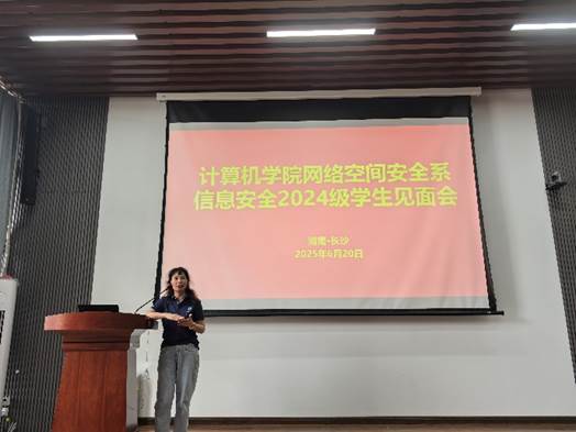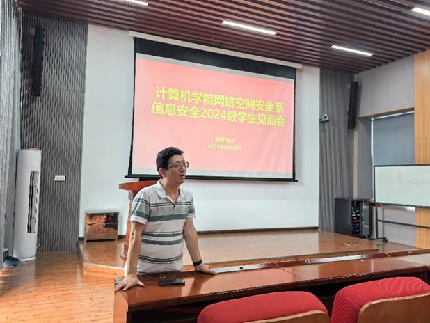 潇湘校区信息楼535举行。本次见面会旨在帮助2024级信安专业同学们做好大学规划、明确学业方向,网络空间安全系教工党支部书记段桂华教授、系主任张士庚教授、系副主任宋虹副教授、辅导员刘家忱老师与全体信安学子齐聚一堂,展开深度交流。