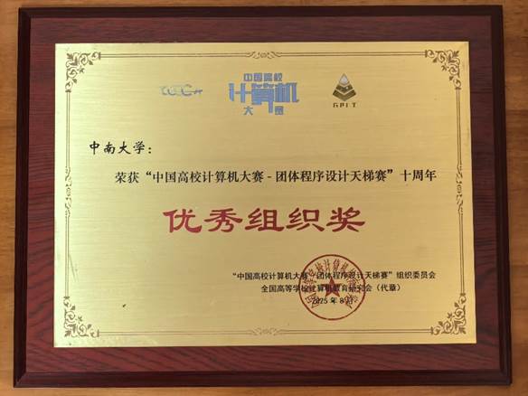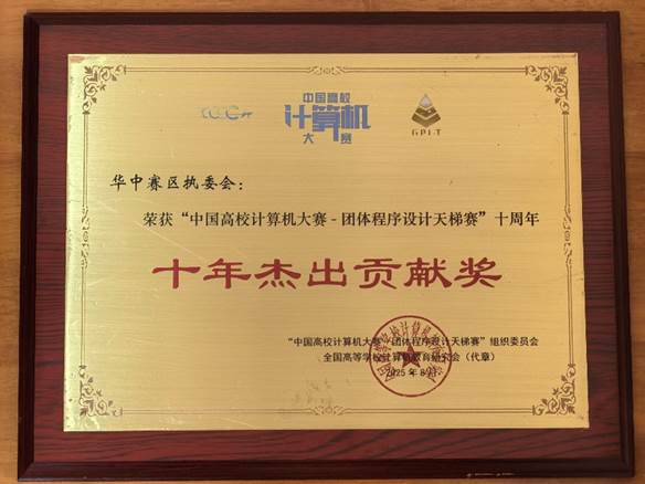 在本次表彰中荣获大赛十周年“高校十年成就奖”、“优秀组织奖”,同时作为华中赛区执委会获评“十年杰出贡献奖”,国家级教学名师、教育部高等学校计算机类专业教学指导委员会副主任、全国高校计算机教育研究会理事长、中国计算机学会教育专委副主任蒋宗礼教授,国家级教学名师、教育部高等学校大学计算机课程教学指导委员会副主任何钦铭教授为我校代表颁奖。