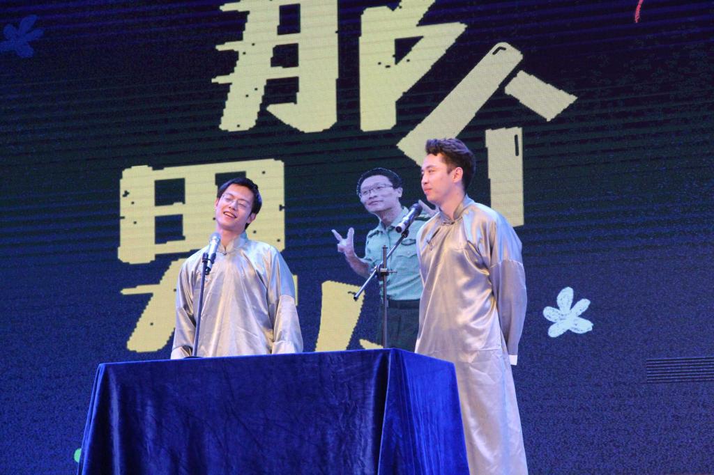 晚会上,师生共舞将舞台推向又一次高潮。辅导员哈纳提、刘逸峰带来的相声《那个男人》用幽默诙谐的语言介绍了辅导员杜文昊,引起同学们一次又一次的掌声。