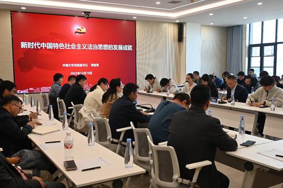2025年12月10日下午,校党委副书记蒋建湘于潇湘校区信息楼525会议室讲授“新时代中国特色社会主义法治思想的发展成就”专题党课,黄漫