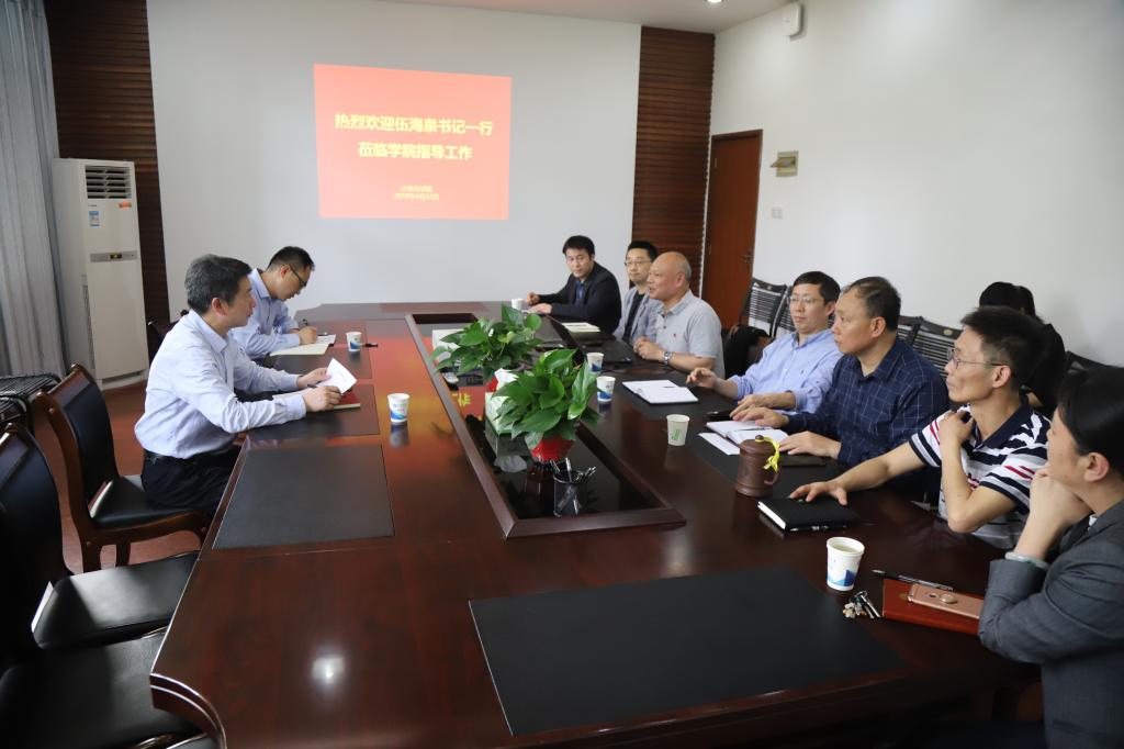 听取了学院情况汇报后,伍海泉书记肯定了学院党政领导班子所开展的各项工作,对于办学过程中存在的困难提出了指导性意见,强调了学院在建立之初,一定要加强党风廉政建设,加强各类风险的防范。同时,他特别提醒学院领导班子要注重团结与融合,凝心聚力,共同建好学院。