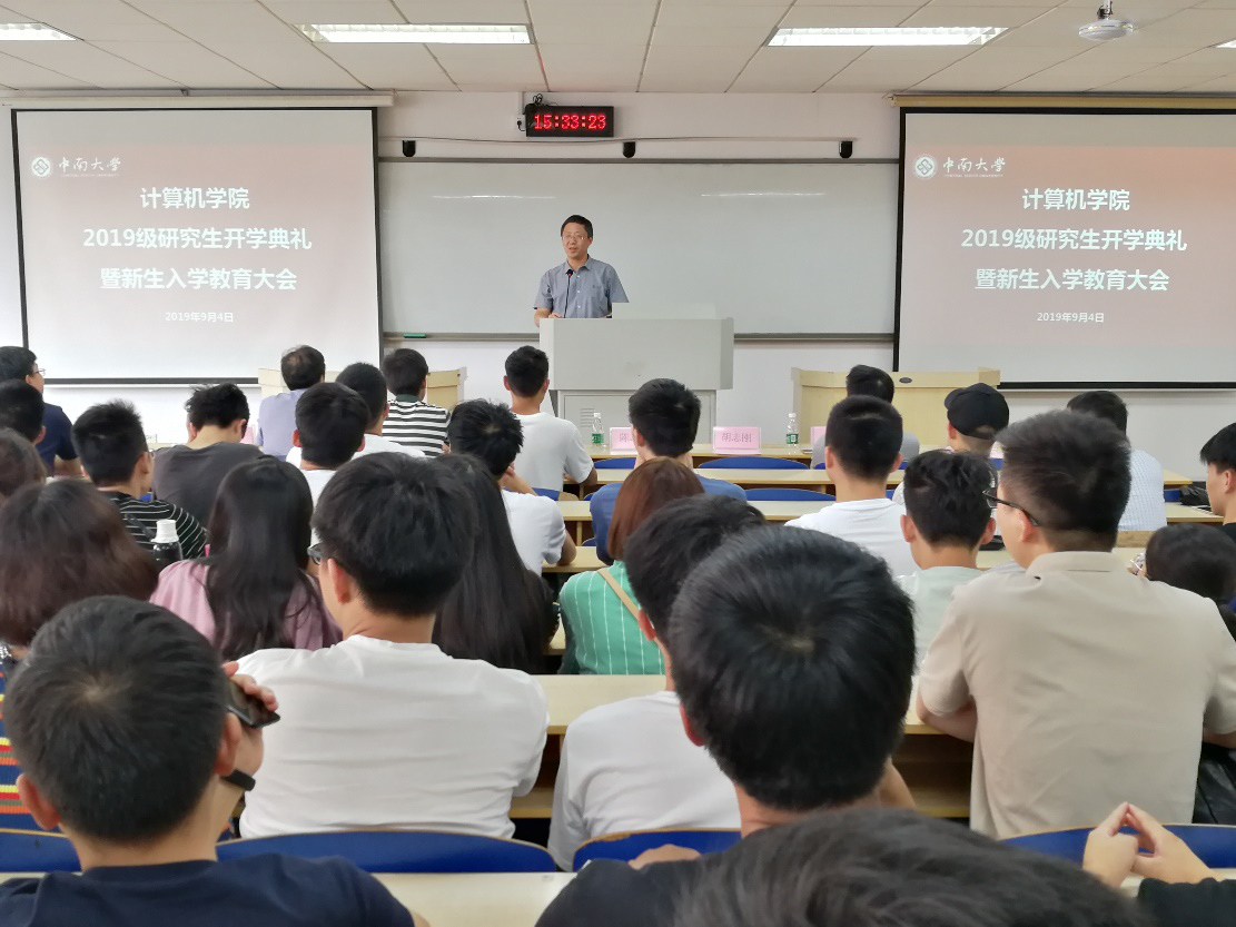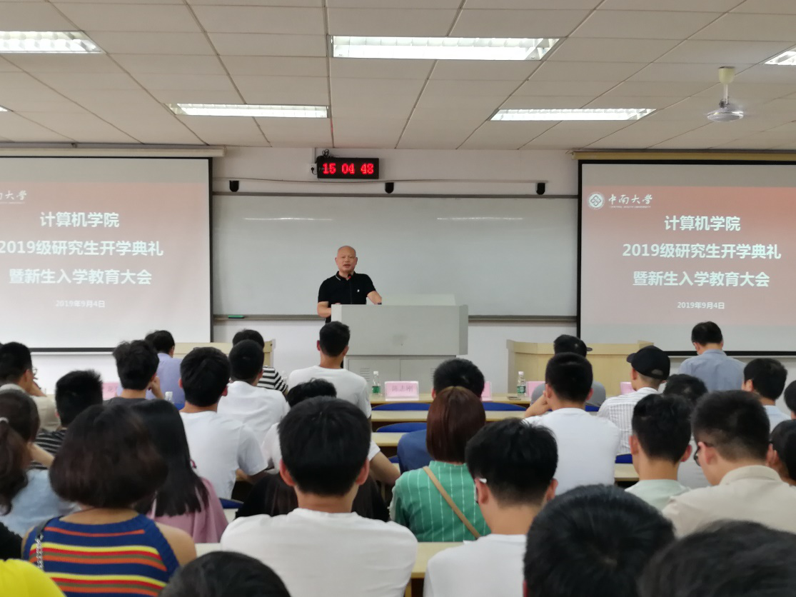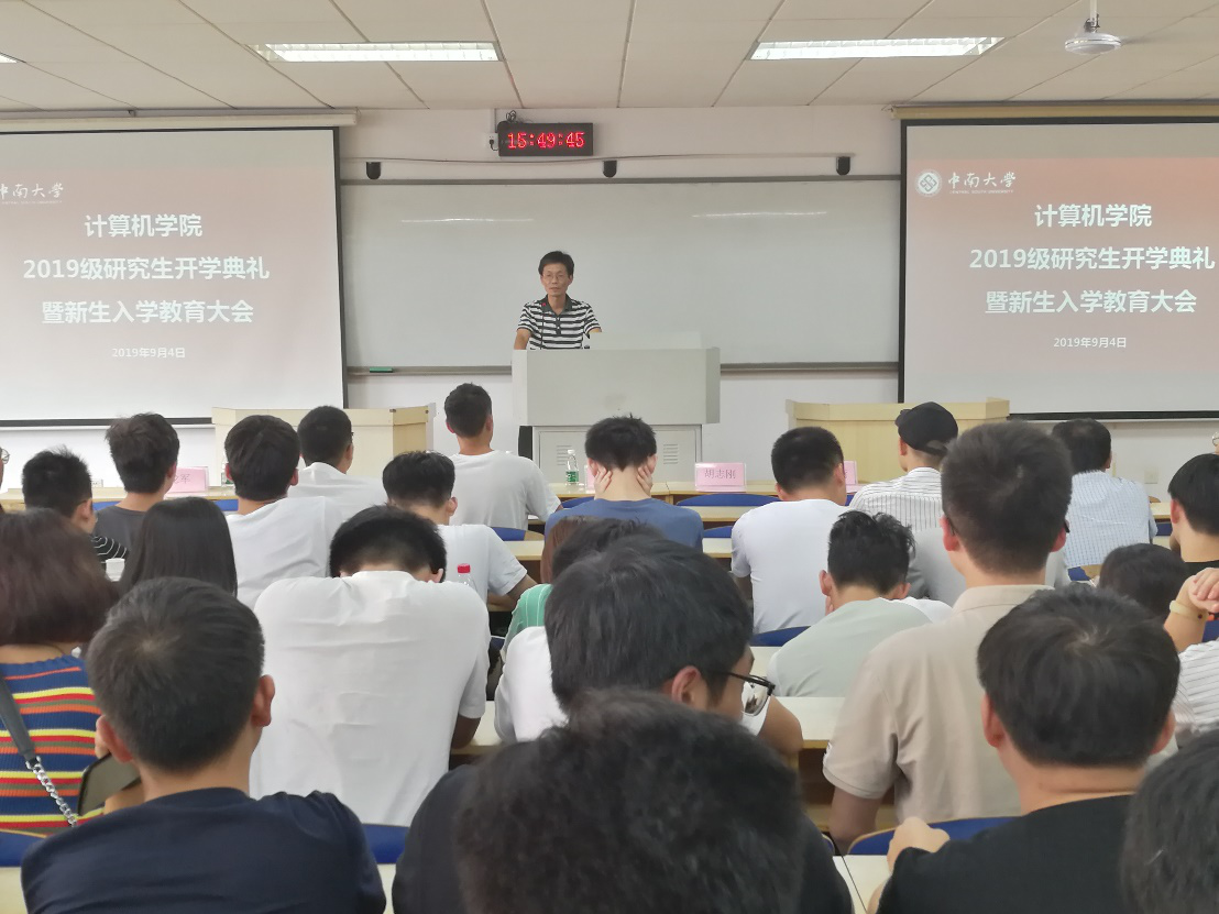 2019级研究生开学典礼暨新生入学教育大会在校本部科教南405召开。院党委书记陈志刚教授、院长王建新教授、院党委副书记史建权老师、副院长胡志刚教授、副院长邓晓衡教授、导师代表任炬老师、学工办主任师雷宏老师出席大会,2019级全体研究生新生参加了本次大会。大会由师雷宏老师主持,共分为开学典礼和入学教育两个部分。