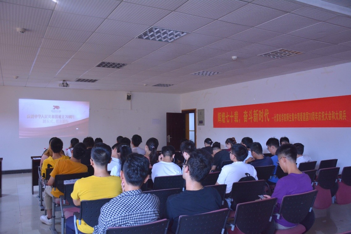 组织党员干部于本部计算机楼和铁道校区第二综合楼进行主题为“辉煌七十载,奋斗新时代”的阅兵仪式观礼活动,学院党委副书记史建权老师、学工办主任师雷宏老师、分团委书记谢怀平老师、辅导员孙龙志、刘逸峰、哈纳提老师以及学院学生党员干部分别在两个校区参与了此次阅兵观看活动,于直播屏幕中共同见证盛世中国的荣耀。