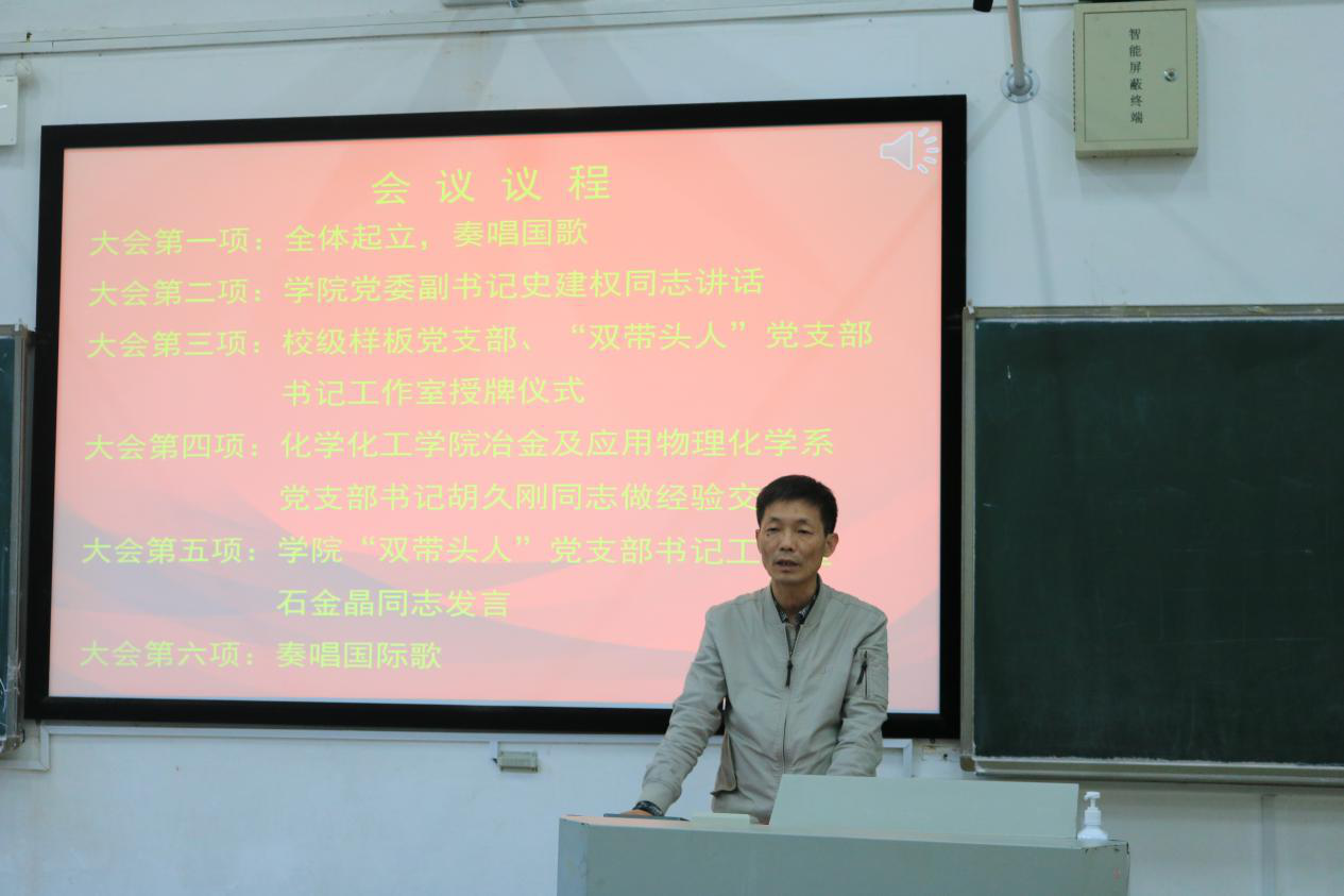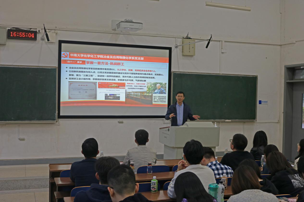 化学化工学院冶金与应用物理化学系党支部书记胡久刚做经验交流。