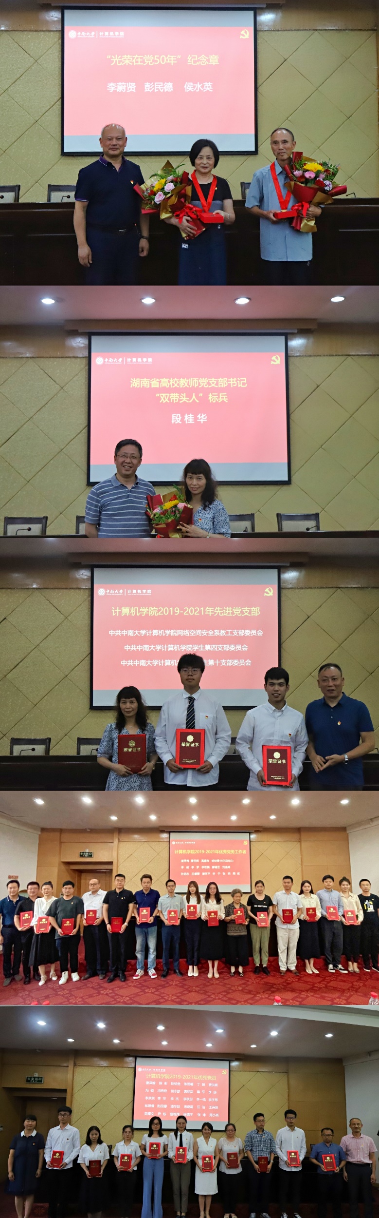 随后,院党委书记陈志刚为彭民德、李蔚贤和侯水英三位同志颁发“光荣在党50年”纪念章,院长王建新为段桂华同志颁发湖南省高校教师党支部书记“双带头人”标兵荣誉证书,学院院党委委员胡志刚、赵明、邓晓衡、奎晓燕、陈先来等为受表彰的先进党支部、优秀党务工作者和优秀党员颁发获奖证书。