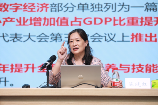 讲座中,陈晓红院士阐述了数字经济时代的新特征。丰富的创新创业场景催生了新技术的融合,也促进了新技术的产业落地。新业态、新模式的不断迸发,推动了传统职业的发展。她提出:高校应着重培养数字经济领域的关键人才,抢占数字经济话语权,为国家数字经济的发展提供坚实的后备力量。