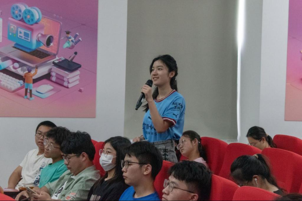 迎新活动等视频为例,指出这些宣传视频的优点和问题,并给出了专业的指导性建议。同时,她以课堂互动的形式引导同学们对短视频制作进行更为深入的思考,引发了学生的创作兴趣。课堂最后,她鼓励同学们在这个创意民主化的时代勇于表达、自由创作,并表达了对同学们能在本次训练营中有所收获的希冀。