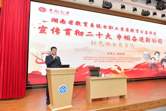 新校区信息楼108报告厅开讲。湖南省政府参事室特约研究员、省关心下一代工作委员会副主任、省委宣传部原副部长、省委党史研究室原主任张志初以《红色湘女更多情》为题,面向200余名女教职工代表进行宣讲。讲座由校工会和校党委宣传部联合举办,黄漫