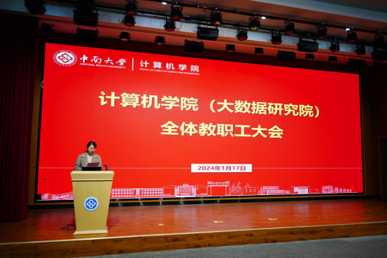 2023年度工作报告。李敏肯定了过去一年学院在人才队伍、学科建设、教学科研、人才培养、文化建设等方面的成绩。通过对标其它高校信息学科,分析了学院当前发展存在的困难和挑战,并对2024年学院教学科研等相关工作提出了希望,她强调,全体教师精诚团结、共谋发展,持续不断丰富研究领域,培养一流学生,打造一流师资队伍,建设一流学科。龙军就学院建设发展情况作情况汇报,分析了目前大数据研究院近年来取得的成绩,存在的瓶颈困境及下一年的目标任务,他鼓励全体教师同频共振,助力学院高质量发展。