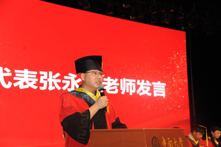 教师代表张永敏老师回顾了与学生们相处的点点滴滴,勉励大家在今后的工作与生活中继续努力,坚持知行合一、经世致用的校训,不断追求卓越,最后祝贺同学们顺利毕业。