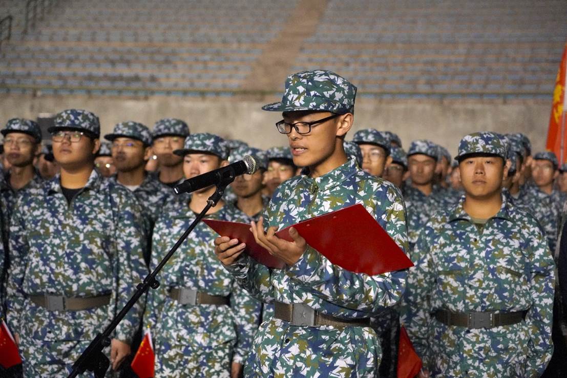 豪迈的歌声落下,学院党委副书记王新辉组织新生诵读诗歌。声起之处如洪钟震耳,气势磅礴。诗歌忆往昔英烈之举,感今日和平不易,锵锵然若金戈铁马,激昂慷慨。诗中亦有王新辉书记对全体军训新生的寄许,希望我们感先辈之志,承先辈之怀,继先辈之业,以红歌唱响时代之音。