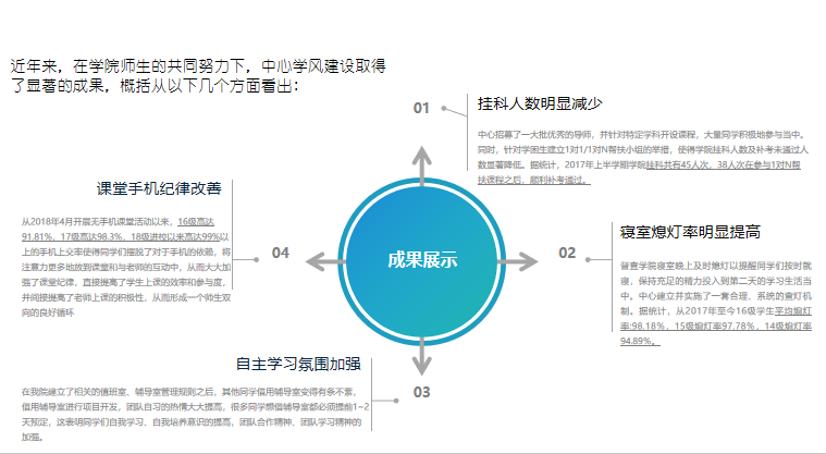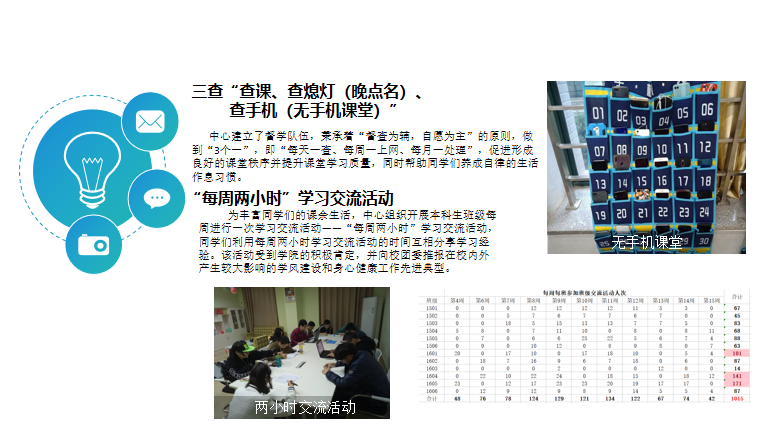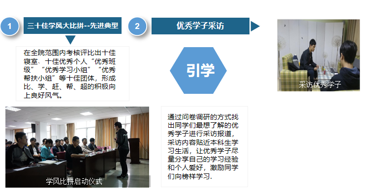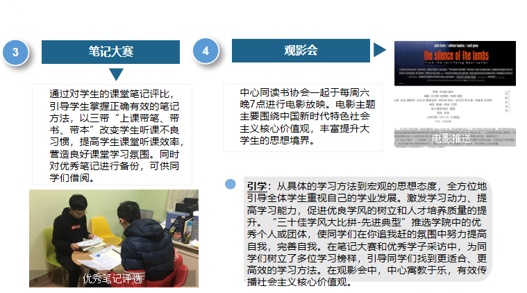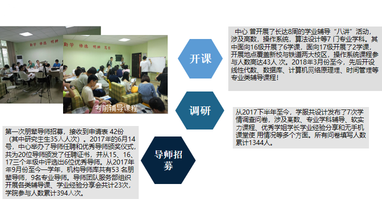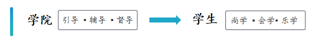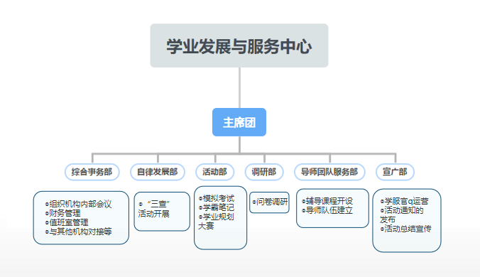 下设学生机构,由学生工作办公室指导和管理。中心主要任务在于,帮助所有学生发展主要学业技能,指导学生顺利完成学业,助力学生成长成才。紧密结合人才培养目标和要求,针对不同年级、不同层次学生的学业特点和发展需求,坚持“以学生为中心、以需求为导向、以发展为根本”的思路,搭建组织化、系统化、科学化、专业化、制度化的学生学业发展平台,着力构建理论与实践相结合、育人与育才相结合、解决思想问题与实际问题相结合的六个“三”育人与学生发展融合体系,以“引导,辅导,督导”为路径,满足不同层次学生个性化、差异化成长发展需求,成就学生的学业与发展,真正做到授人以渔、因材施教、因材施帮,助力学生实现“尚学·会学·乐学”,成为德才兼备之才。