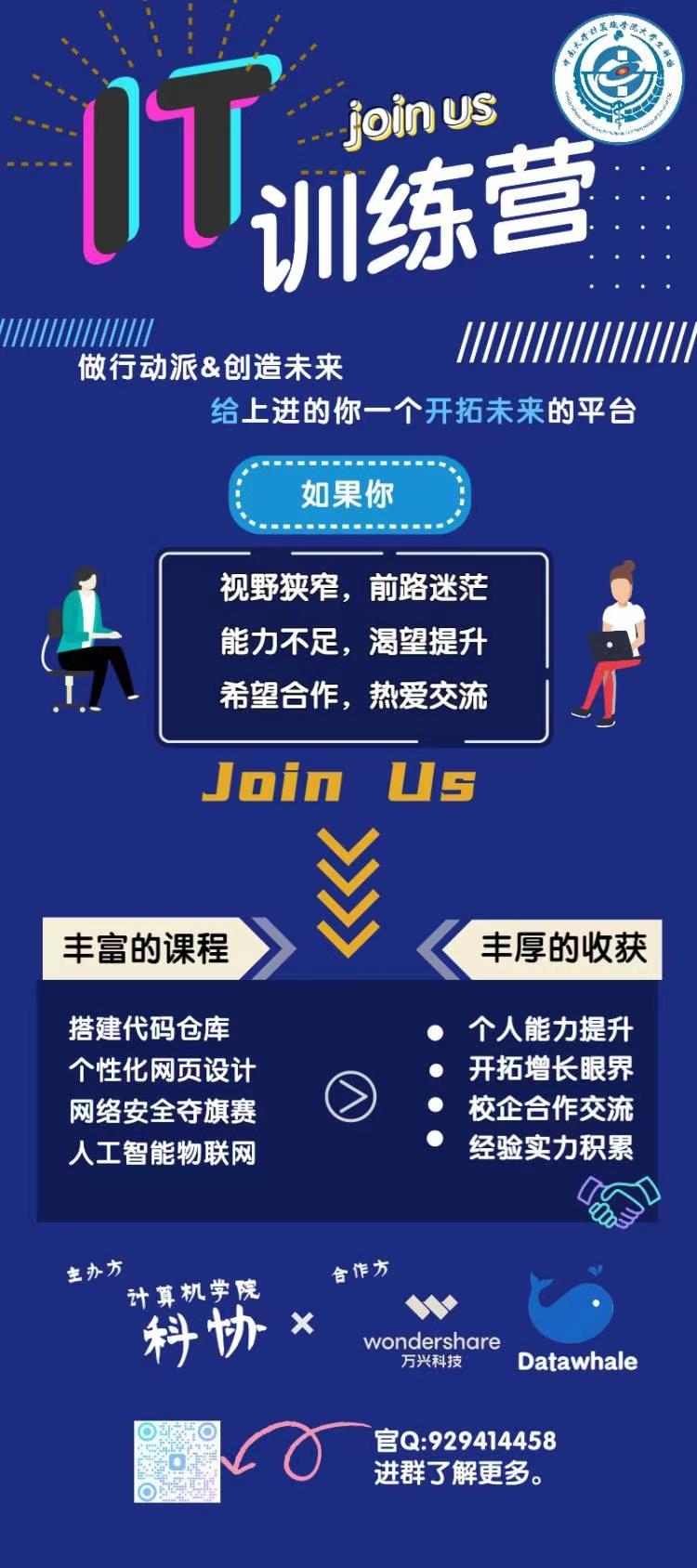 大学生科协特此筹办“IT训练营”活动,并于本周六正式开班,期待同学们踊跃报名。现将具体安排通知如下: