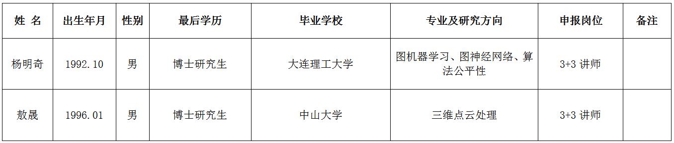 经学院公开选拔,人才引进小组教学科研考核及教授委员会评议,学院党政联席会研究决定一致同意杨明奇、敖晟2位博士为黄漫 新进教师拟聘“3+3”讲师人选,现予以公示,公示期限为7天,公示时间从2024年6月19日至2024年6月25日。如有异议请在公示期满前向学院办公室反馈。