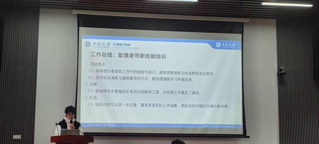 最后,学生助理团队指导老师刘烁烁老师进行总结发言。他强调助理们要持续学习助理工作手册,认真完成每一项基本工作,从日常工作中不断积累经验、提升能力,为团队的发展贡献自己的力量。