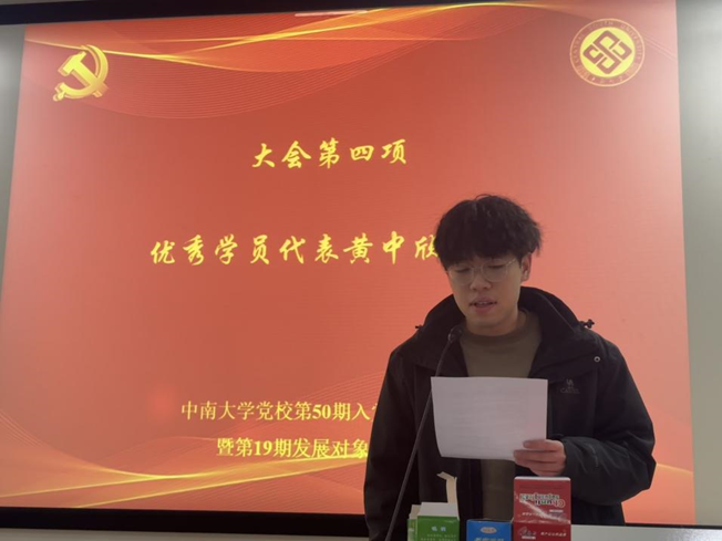 典礼第四项,优秀学员代表黄中欣发言。黄中欣同学分享了自己在学习过程中的一些感悟和体会,他表示经过这一阶段的培训,深刻认识到作为新时代青年应勇担责任、服务社会,在今后的学习生活中,也要不断向党组织靠拢,在思想和行动上与党组织保持一致,努力提高思想政治觉悟,发挥先锋模范作用。