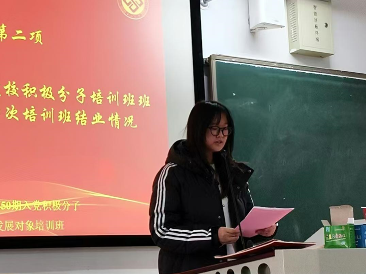 典礼第二项,由积极分子培训班班导师韦新雨宣读本次培训班结业情况。经过党校考核,本期培训班共计114位积极分子、81名发展对象顺利结业,其中12人获评优秀学员,2人获评优秀学员标兵。她表示,培训为提升积极分子、发展对象的党性修养和爱国情操搭建了良好的平台,结业是新的起点,希望大家在今后的学习生活中继续发扬优良学风和作风,发挥先锋模范作用,端正入党动机,早日入党。