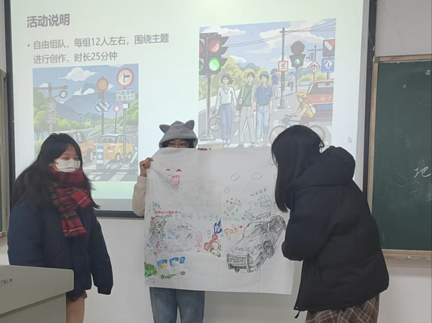 同学们自由组队,以画笔为媒介,以交通安全为主题,用线条和色彩勾勒出心中的安全出行愿景。在创意的碰撞中,交通安全理念以艺术的形式展现,激发每个人对生命的珍视和对安全的追求。之后,每组派代表上台来介绍本组的作品,一幅幅画作各有千秋,充满趣味,成为交通安全意识的最佳展现。