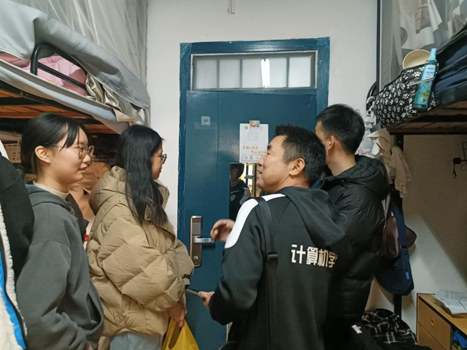 党委副书记王新辉、22级辅导员陈司宇走访计算机科学与技术专业22级本科生寝室。深入宿舍,了解“五好寝室”建设情况,节日慰问,送上元旦祝福,同时,针对用电防火安全及消防防患意识进一步排查,提出整改意见,将风险防患于未然。