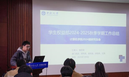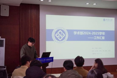 会议第二项,各部门部长依次对本部门工作进行总结。文体部部长祝月指出,研究生趣味运动会站位高、参与广、意义佳,极大地提升了同学们的团队协作精神与运动能力,充分展现了同学们的青春风采和活力;宣传部部长刘天杰总结了学术讲座、研讨会等活动宣传开展情况,罗列数据,突出成效;综合事务部部长陶怡佳总结报账、后勤等工作,切实确保了流程完整、合规;学术部成员伍天睿介绍,本学期学术部举办学术报告二十余场,涵盖学术论坛、创新项目、求职沙龙等多个领域;学生权益部部长敬亚霖表示,权益部积极落实学生的切实需求,如后勤食堂意见的收集反馈等,并协助其他部门开展工作。