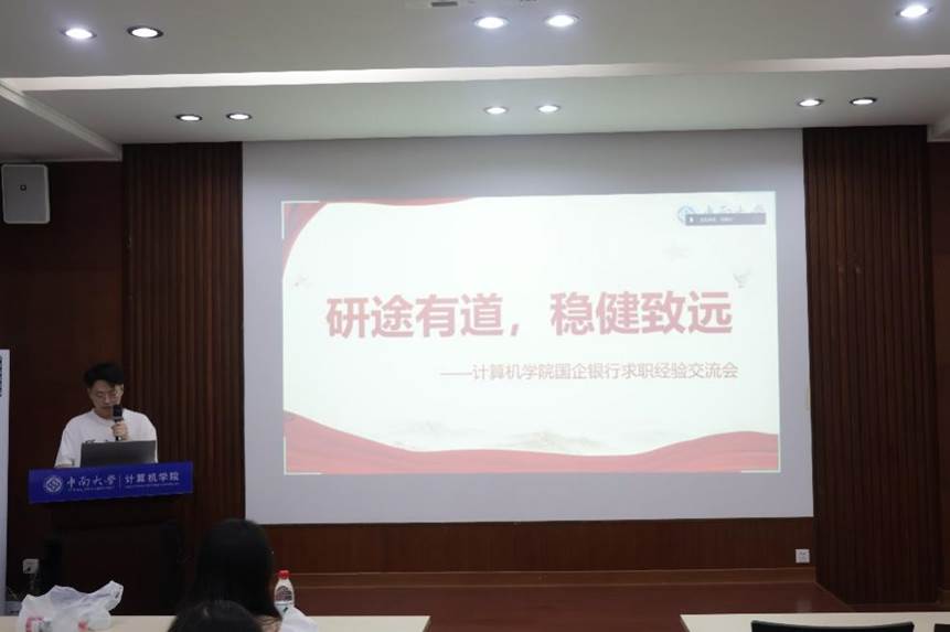 阿瑾学姐(中国农业发展银行软件开发中心研发岗)首先进行分享,她系统梳理了银行求职的核心要点:在行业认知方面,她详细解析了银行体系架构,强调银行招聘既看重应聘者的专业技能,更注重沟通表达、逻辑思维等综合素质;在笔试准备环节,建议通过历年真题训练掌握题型规律,并推荐了高效的自学资源;针对面试策略,她重点分析了群面、单面和压力面试等不同场景,分享了"保持冷静、突出逻辑、展现行业热情"的实战技巧;最后,她特别指出优质实习经历是简历的重要加分项,鼓励同学们在校期间积极争取金融机构实践机会,以切实提升就业竞争力。