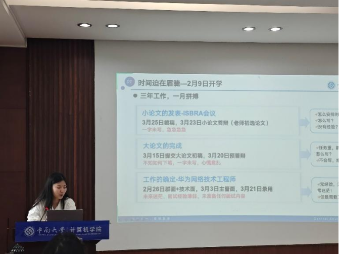 接着来进入嘉宾经验分享环节,嘉宾们从自身春招求职经历出发,依次介绍明确求职目标、网申、笔试、面试等环节的整体流程,详细讲解了求职时间线。王艺瑾学姐以“论文与春招并行作战”为切入点,分享其“时间切片管理法”:将每日时间划分为“论文攻坚时段”“网申专项时段”“面试模拟时段”,并利用“番茄钟工作法”实现多线程任务高效切换。