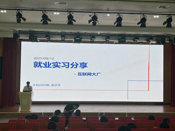 会议第三项,26届优秀毕业生进行实习经验分享。张子洋同学针对前端工程师岗位分享实习经验,重点从就业比较方向为同学们提供思路。他认为在选择工作时,需综合考虑工作地点、工作时长、薪资待遇、核心部门、工作氛围五大维度,结合自身实习经历分析不同维度对职业发展的实际影响,最后建议同学们摒弃“盲目跟风选岗”的心态,根据个人职业规划与生活需求,选择最适合自己的岗位,同时提醒大家提前巩固前端基础技能,为求职做好准备。