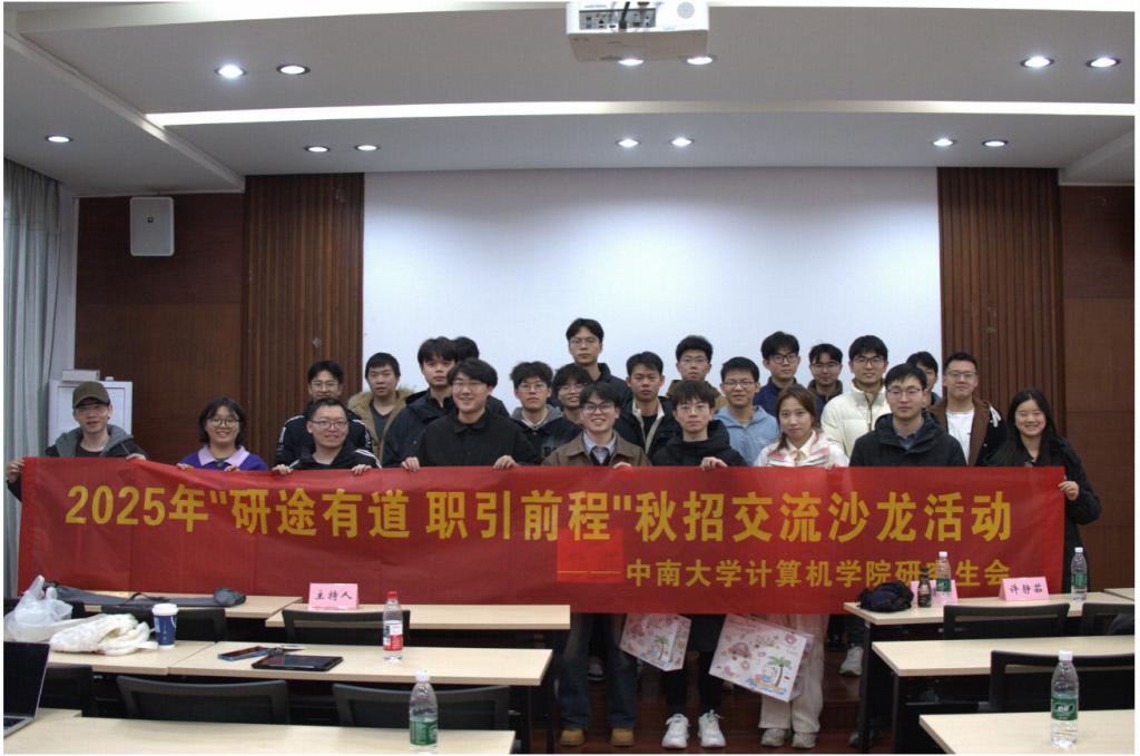研究生会(以下简称“研会”)在岳麓山校区计算机楼313会议室成功举办“研途有道,职引前程”研究生秋招交流沙龙。沙龙由研会成员王丹主持,研会指导老师周清菡受邀出席。本次活动采用“线下主会场+线上直播”双模式,吸引全院200余名研究生及本科生参与,线上累计观看超150人次。沙龙主要包括经验分享与交流互动两大环节。