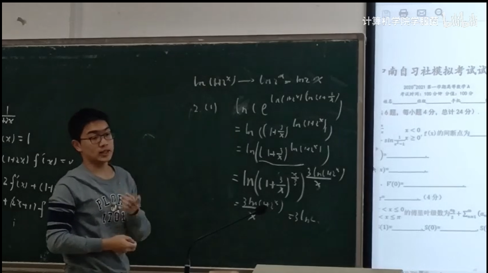 1月11日下午4点,概率论与数理统计考前第二次辅导开始,仍由来自软件工程1904班的朋辈导师卓世龙主讲。导师对近两年的考题进行了“地毯式”排查,逐一分析,步步为营,既讲解了考题,又把涉及到的知识点带领大家复习了一遍。经过两次考前辅导,相信同学们对自己的信心增强了不少,一定可以去得好成绩。1月13日晚上7点,高等数学考前第一次辅导正式开讲,主讲导师是来自数统院应用数学1701班的赵启杨。赵启杨导师凭着扎实的专业知识,将之前高数模拟考试试卷分析得十分透彻。导师的分析过程思路清晰,前后逻辑连贯,板书工整,且声音洪亮,相信同学们收获一定很大,对知识点的理解会进一步加深。