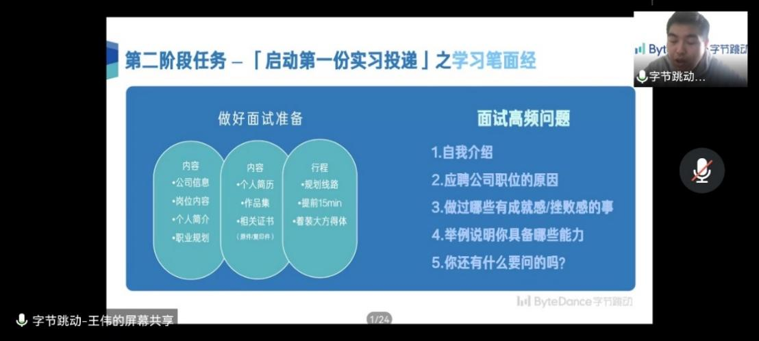 20级研究生辅导员刘逸峰老师主持,并邀请字节跳动资深HR王经理为同学们做出指导。