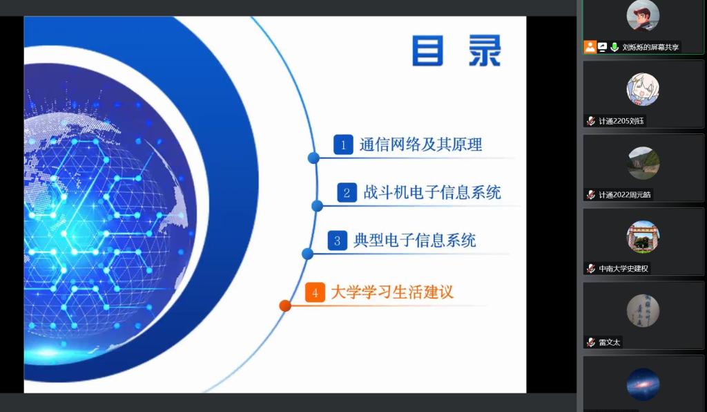 授课中,张总经理从通信网络及其原理、战斗机电子信息系统和典型电子信息系统三个方面向参与讲座的新生们进行了详细的讲解,用易懂且不失专业性的语言、生动的例子、形象的图片和严谨的数据加深了新生们对电子信息科学的认识和理解。