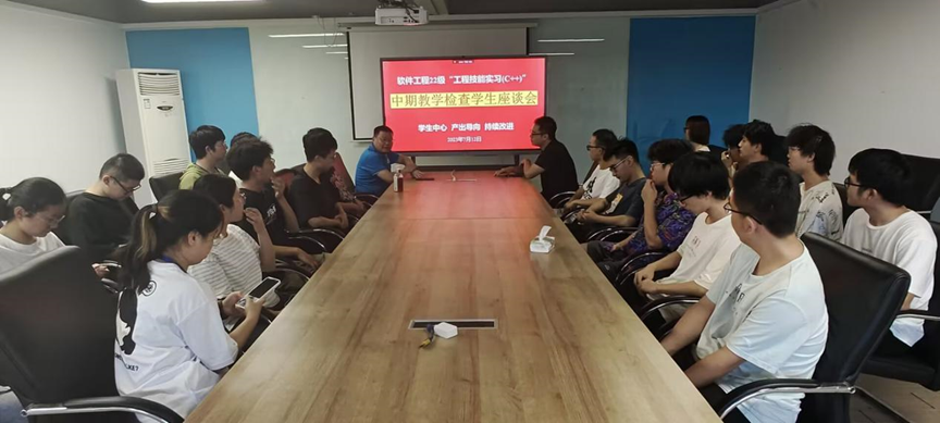 2023年7月12日在软件系费洪晓教授与辅导员何星霖老师的主持下中期教学检查学生座谈会顺利召开。会上同学们畅所欲言、各抒己见,不仅总结了这十天来在基地的学习生活的切身感受还提出了诚恳务实的意见建议,从而让下一阶段的实训工作得以更好开展,同时也为学弟学妹们的实训活动提供了宝贵的经验。