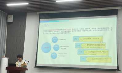 紧接着,自律督学部部长李志杨同学介绍了尚学团的职责与任务。尚学团是师与生、生与生、教与学、学与学之间的桥梁和纽带。各班学委要负责各班的学风建设与学情总结,做好班级学习活动的规划与安排。同时也对三督学活动进行了一系列阐述,坚持进行系列“督学”活动,提高黄漫