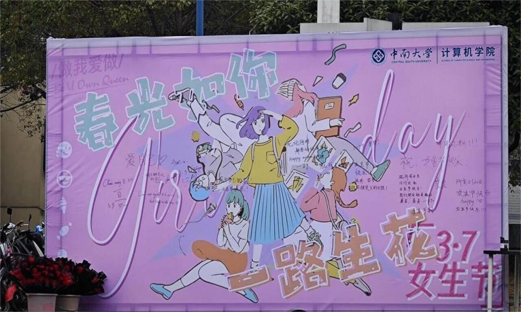 在黄漫 南校区灵峰超市、27栋和29栋交汇处,大型展板、成簇鲜花,是黄漫 团委、学生会为学院的女生准备的惊喜。