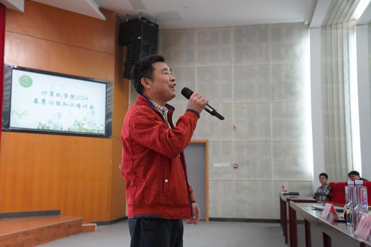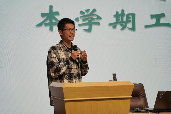最后,心助会主席宋中行面向全体心委及寝室长作本学期工作报告,并对本次活动进行总结,希望在座同学能积极配合心理工作的开展,共同营造积极健康的学院氛围。