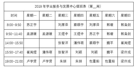 备注:括号内是该时间的值班人员,若值班人员临时外出,可电话联系,联系电话如下: