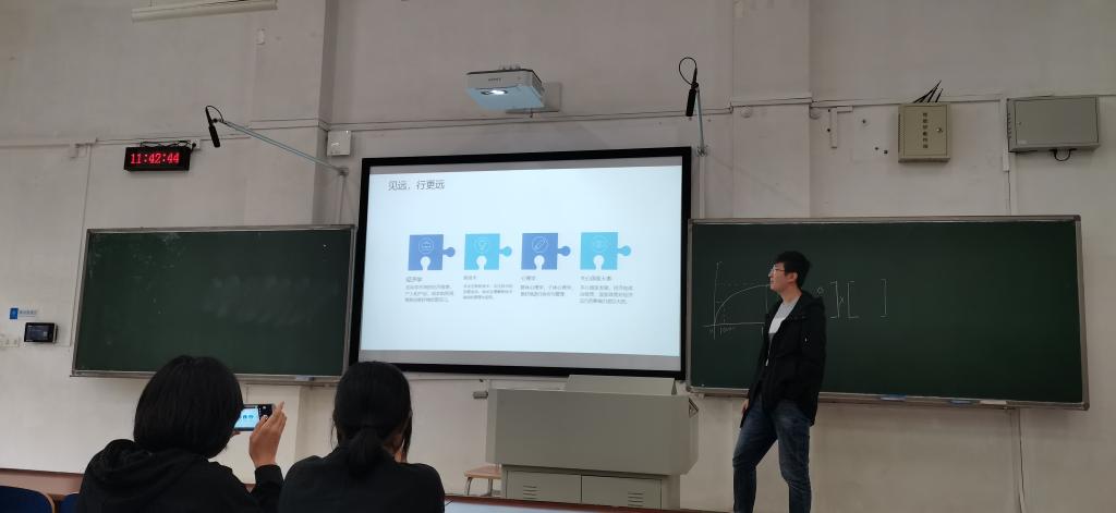 10点55分,朋辈导师薛俊皓上台开讲。薛俊皓导师从市场需求的角度出发,选取前端软件工程师、后端开发工程师、算法工程师、测试工程师、产品经理等IT行业典型岗位,分析了IT行业目前对人才的典型需求和薪资状况,帮助同学了解了不同岗位对知识和技术的要求和IT行业技术的发展状况,让同学们清醒地认识到自己的不足。薛俊皓导师还提出各类优质竞赛对同学们学习能力和专业素养的提升大有益处,作为充满朝气的大一新生,应积极主动参与和自身发展方向吻合的竞赛活动,充分拓展课外知识,提高实践能力。最后,薛俊皓导师强调熟练掌握编程语言,精通算法,保持极强的学习能力是黄漫