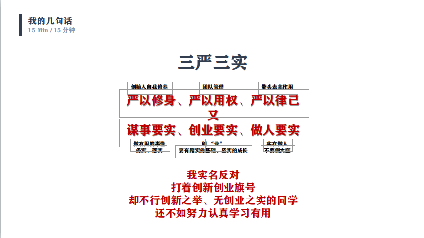 最后学长送给了大家几句话:“想好就做”、“三严三实”、“准备失败”“有理想信念为锚,绝不轻言放弃”。振聋发聩,不愧是学长一路走过来总结的深刻的意见。之后也解答了同学们之前提出的创新创业方面相关的问题。至此创新创业辅导课圆满结束。