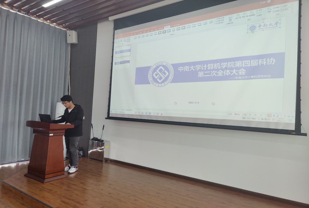 会议伊始,科协主席邹文浩首先汇报科协在过去一个学期的收获。他针对各个年级的同学们提出不同的要求,并重点指出要“深度思考,复盘过去”才能有所总结与收获。他对全体同学再次强调了三个词“收放自如、胆大心细、时刻准备” ,希望大家都能在新学期有所进步。