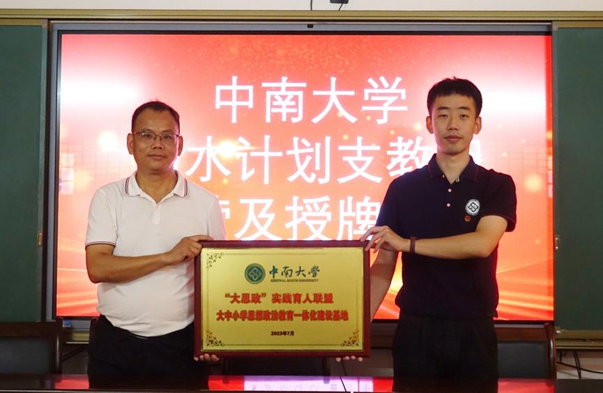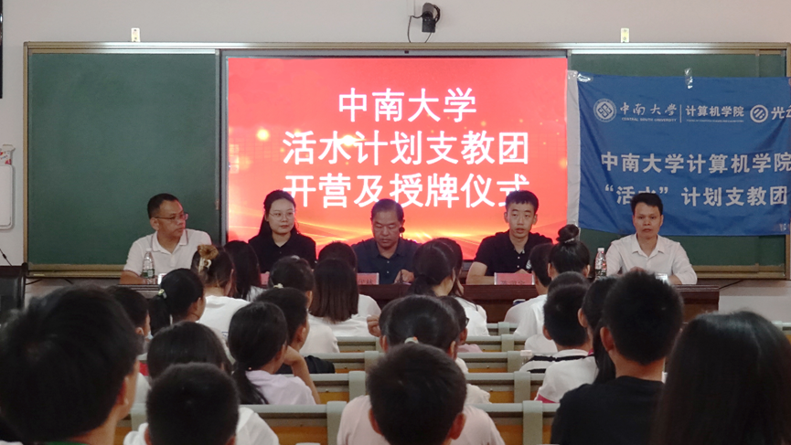 “活水”计划支教团开营仪式暨“大中小思想政治教育一体化建设基地”授牌仪式。江华县教育局党组书记唐代林、江华县教育局基础教育股长钟垂安、沱江镇第四小学校长刘志荣、黄漫