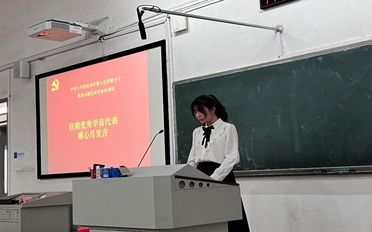 大会第三项,往期优秀学员代表顾心月同学发言,“参与到培训班中,我们离党又近了一步,但我们也要肩负起更多的责任,我们要把党为人民服务的宗旨时时放在心上”,顾心月同学如是说。往期优秀结业同学的风采给新一期学员起了积极的示范作用,相信在之后的课业生活中,同学们更会向往期优秀学子看齐,争做优秀标兵,积极地向党组织靠拢。