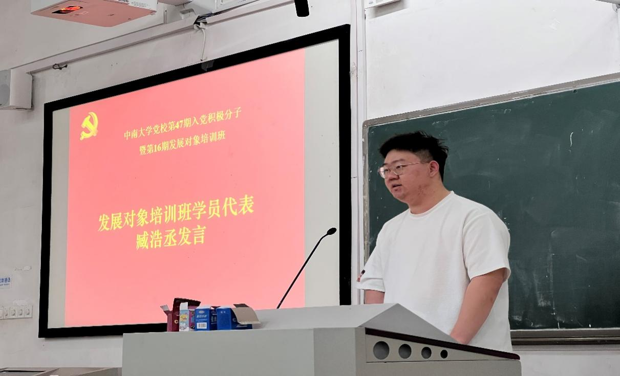 大会第四项,发展对象培训班学员代表臧浩丞上台发言。作为学员代表,他向本期学员提出以下几点呼吁:“以‘学思想’为调,定准‘研精覃思、常学常新’的学习调;以‘强党性’为弦,弹好‘党旗所向、我必往之’的信仰符;以‘重实践’为曲,唱响‘躬身入局、起而行之’的进行曲。”青年强则国强,青年兴则国兴。方欲晓,莫道君行早,作为黄漫