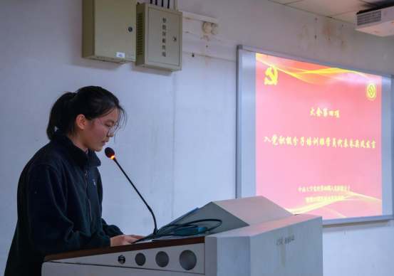 组织干事刘珍珍、培训班班导师周清菡和袁熠出席会议。大会由周清菡主持,第48期入党积极分子与第17期发展对象培训班全体成员参与了此次仪式。整个会场秩序井然,全场气氛庄重严肃。